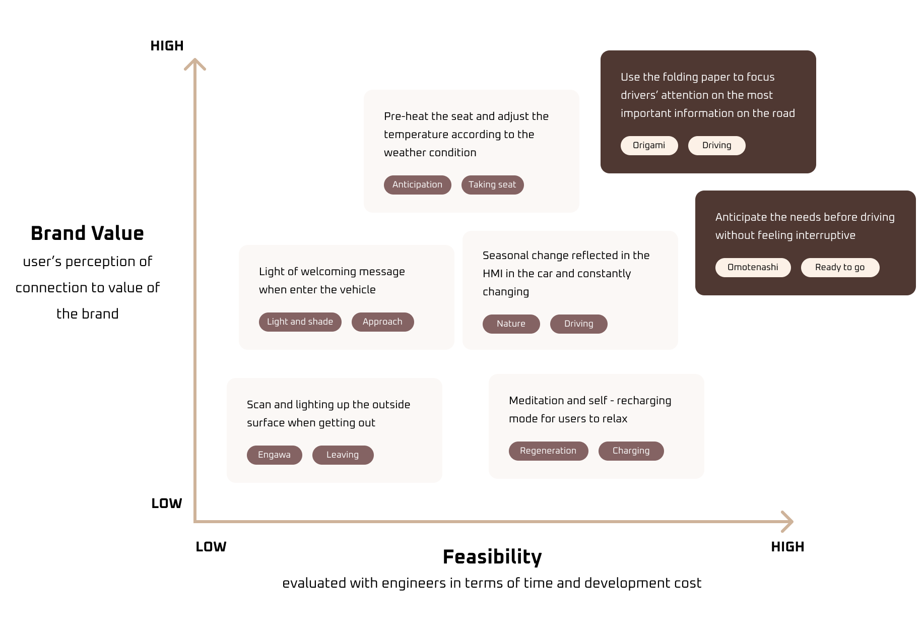 To find the solution, I used a prioritization matrix to categorize our concepts. It plots each concept based on two weighted criteria: feasibility and brand value. Brand value means how much does this concept connects user to the uniqueness of Nissan brand.