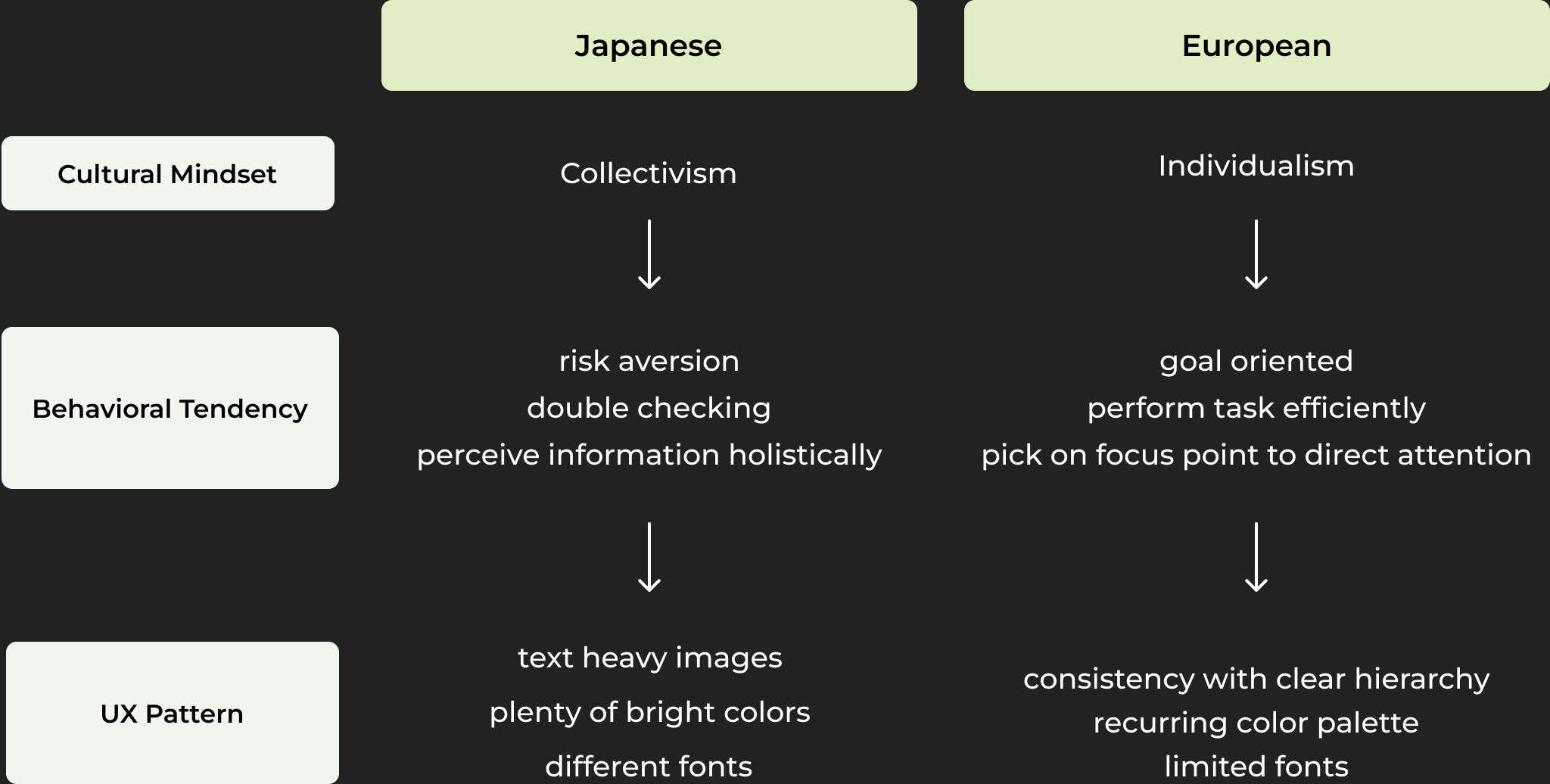 To bridge the gap between culture and user experience, I introduced Hofstede Culture Dimension. Hofstede’s theory provides a systematic framework to compare multiple cultures from 6 dimensions.