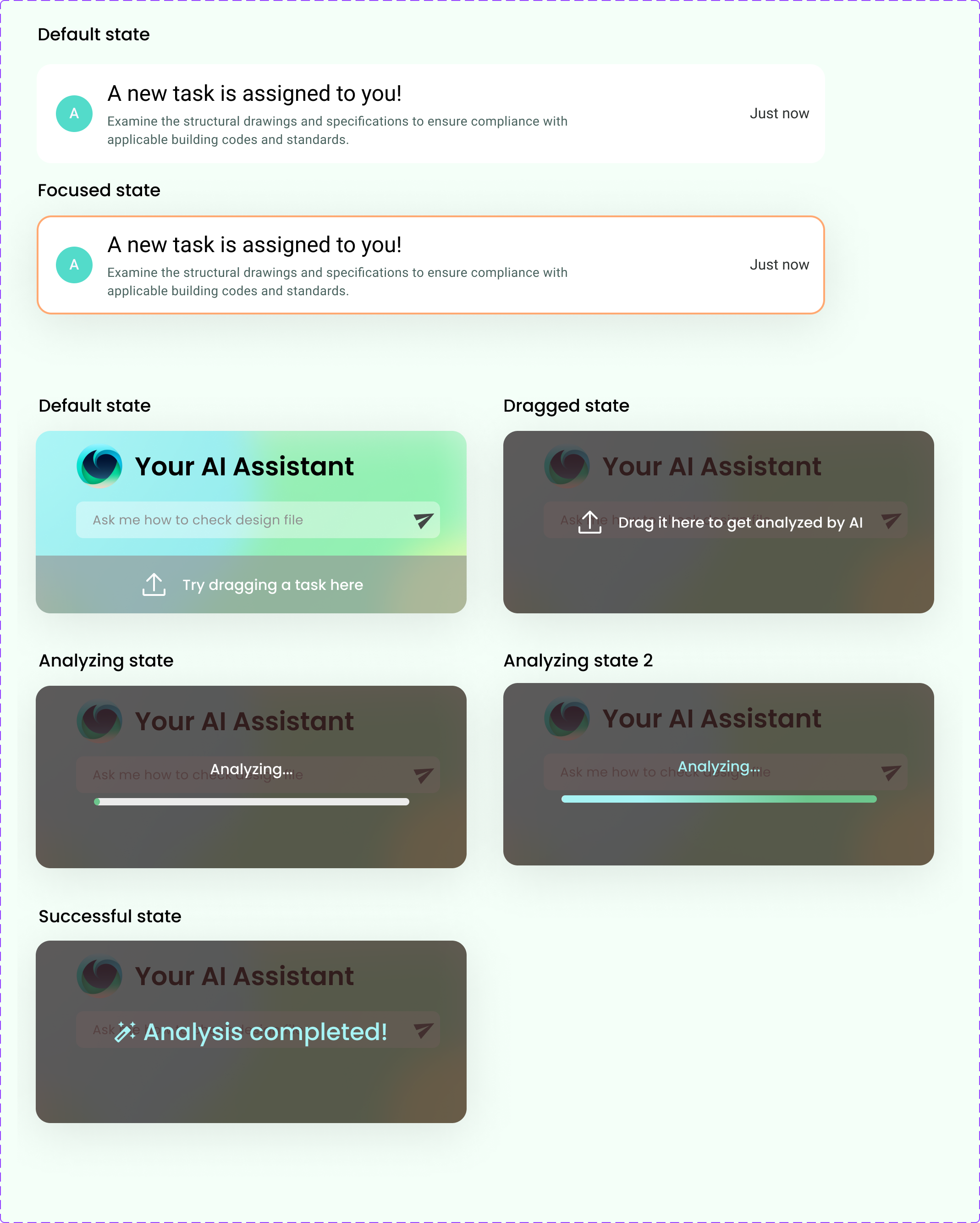 Start small and build big! I started designing the smaller blocks, such as the focus state of draggable item and the analyzing states of the drop area.