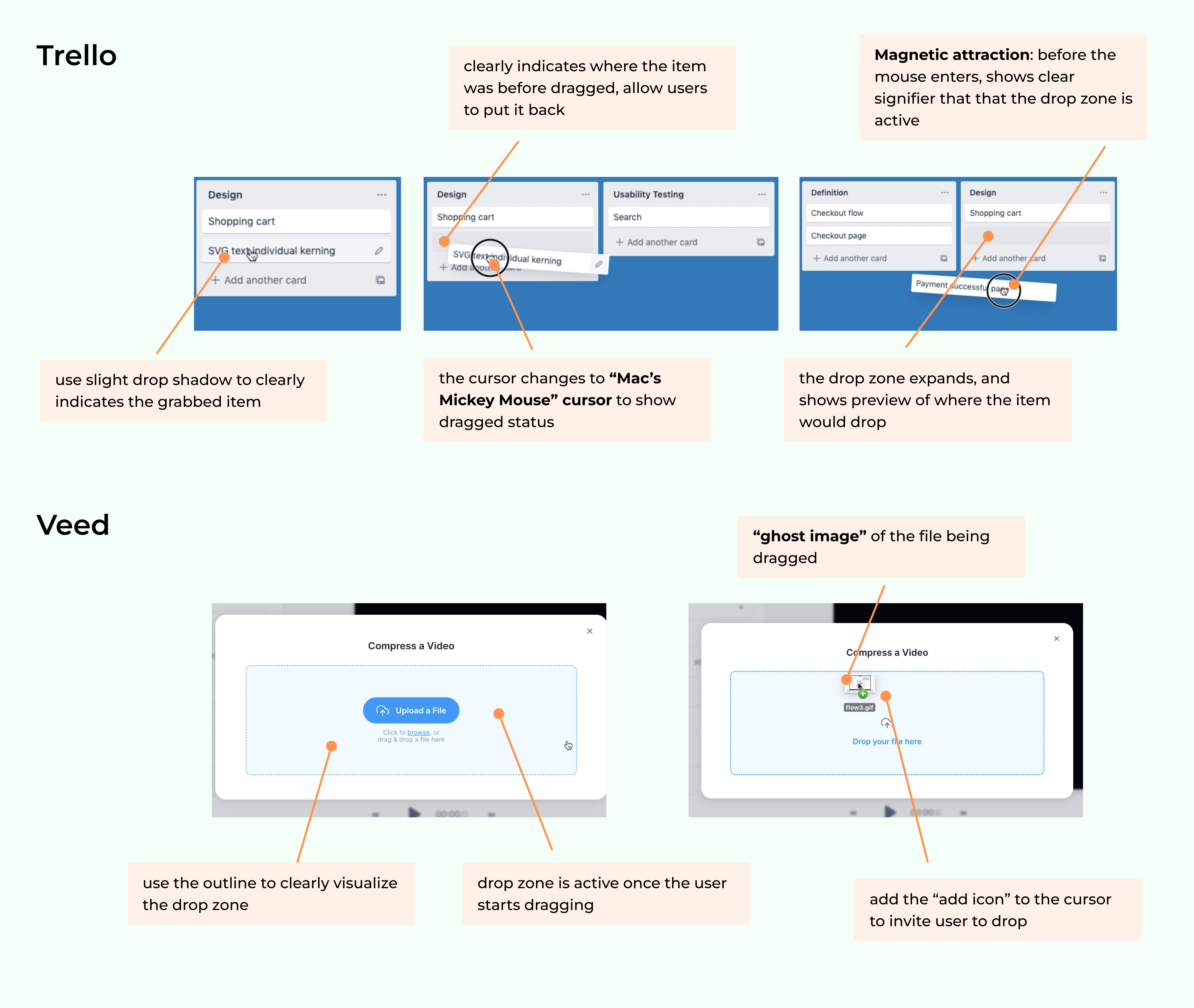 At this stage, I did not jumped right to fixing the existing issues, but took a step back to do small desktop research. I wanted to dive deeper into how mature softwares build this drag and drop interaction and what are the key elements.